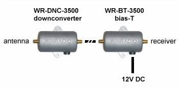 方式一:下變頻器安裝到天線和接收機(jī)之間的接收機(jī)端,通過帶SMA接頭的低損耗同軸電纜相連。在這種安裝方式下,電源直接連接到下變頻器。我們建議使用性能好的濾波電源,如Winradio的 SF-41系列電源(該電源隨下變頻器一起提供)。